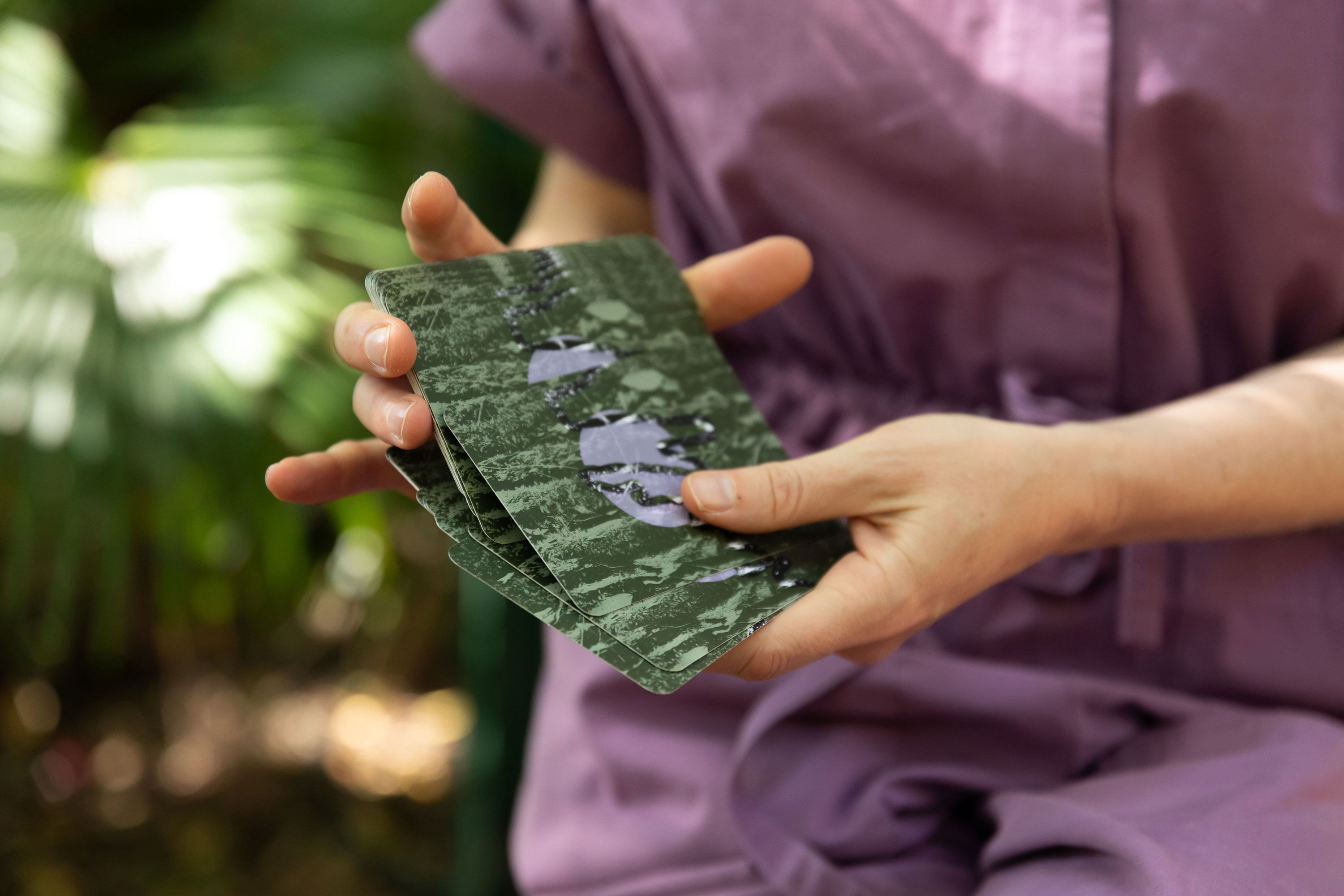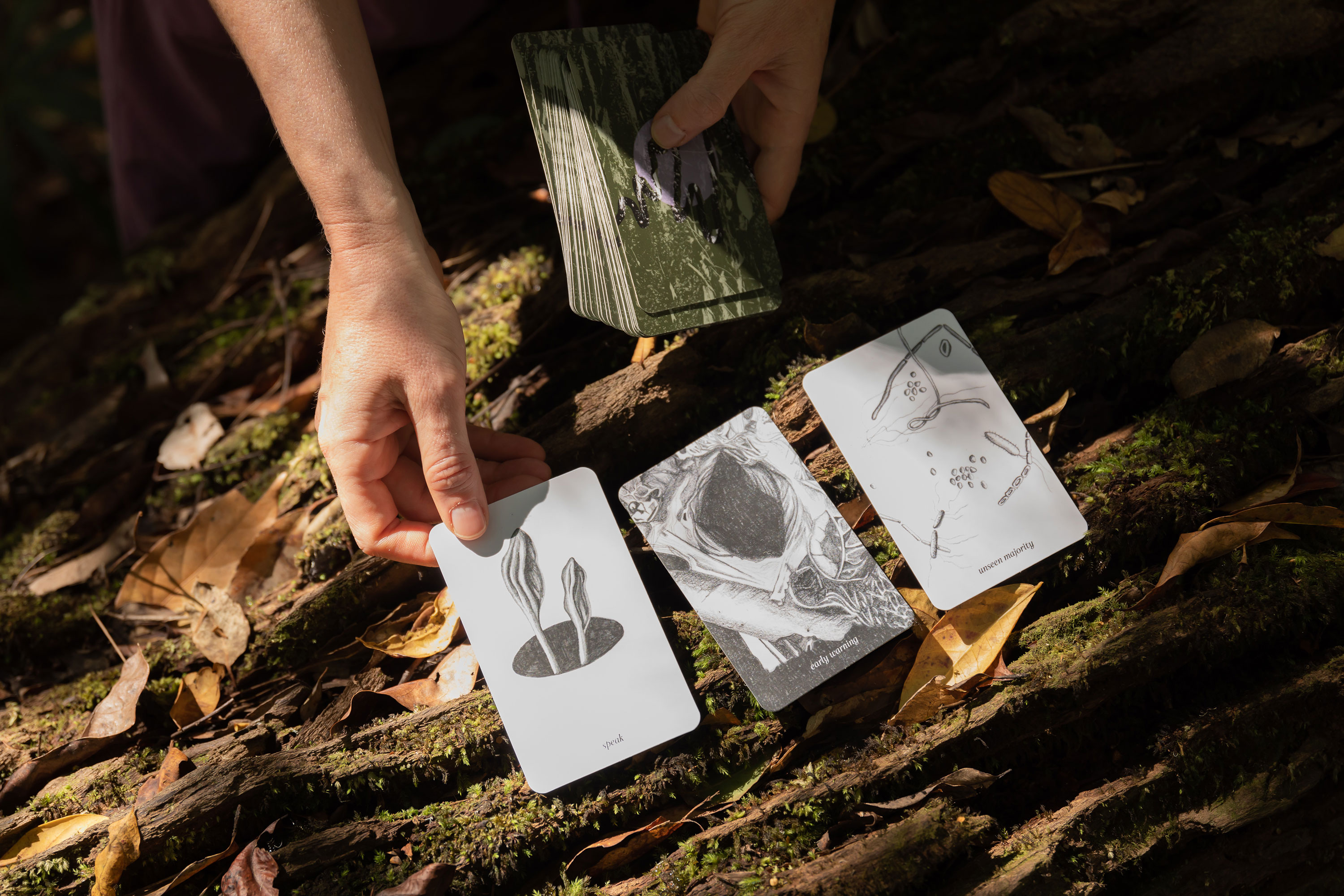 For recompose, Franzmann created a deck of divination cards depicting the organisms present in the leaf litter, detritus and humus of the Maroochy Regional Bushland Botanic Gardens. During a one-on-one experience with the artist, or through the online platform, participants select a card from the deck and receive a unique reading that responds to the survival mechanisms and ecosystem interactions of the decomposer depicted on the chosen card. Franzmann’s work celebrates the magic and wonder of decomposition to consider how it isn’t just the end of everything—it is also the start’ Megan Williams (curator)